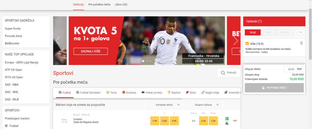 Sa leve strane se nalazi meni na kojem se nalazi izbor sportova na koje može da se položi opklada. Tu su još ponuda SUPER KVOTE, BET BOOSTER kao i PONUDE DANA. Takođe, jedan deo menija je rezervisan i za NAŠE TOP OPKLADE gde su po događajima i ligama razvrstani najigraniji parovi.